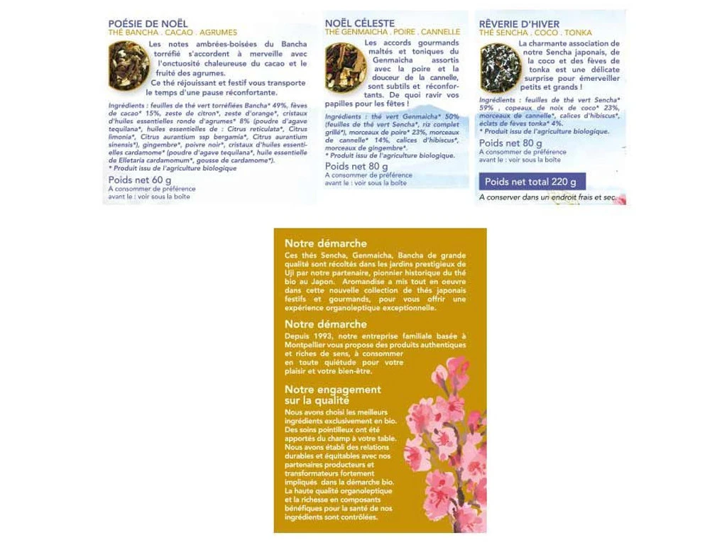 Un coffret composé d’un trio de thés japonais festifs : Rêverie d’Hiver (Sencha – Coco – Tonka), Noël céleste (Genmaïcha – Poire – Cannelle) et Poésie de Noël (Bancha – Cacao – Agrumes).