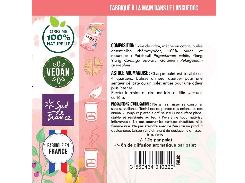 Ces palets parfumés sont fabriqués dans le Sud de la France ! Les palets parfumés permettent une diffusion plus rapide des senteurs que les bougies.