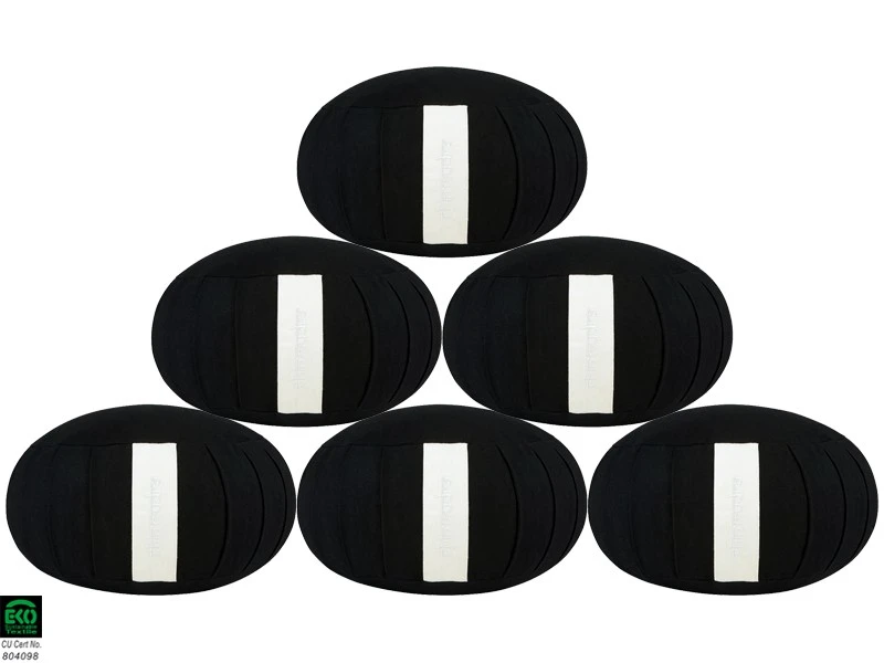Lot de 6 Zafus Standard 22 plis profonds pour une meilleure tenue du coussin dans le temps, 100 % coton issu de l’agriculture biologique certifié par GOTS de couleur noir rempli de balle d’épeautre certifié Biologique par LACON INSTITUT.